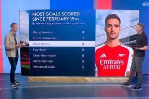 自二月出任前锋后梅里诺各项赛事打进6球,英超所有球员同期第三